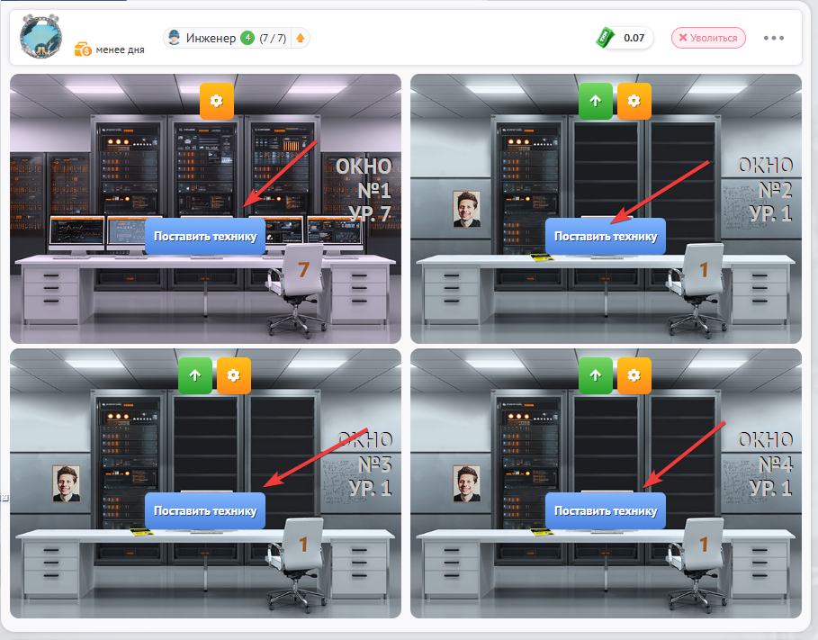 Вы устанавливаете свою машину или бульдозер в свободное окно. Чтобы установить технику нужно кликнуть “Поставить машину”