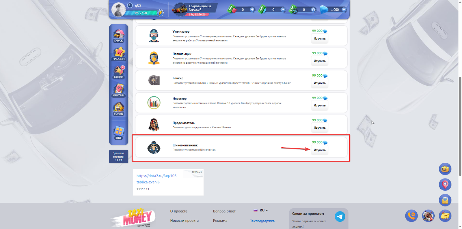 Найти навык “шиномотажника” и изучить его